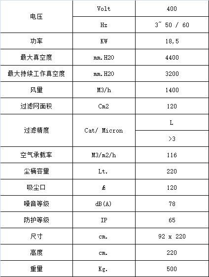 吸取的物質(zhì)都將收集于帶輪子的集塵箱里(220升),從而可以方便安全處理被吸的物質(zhì)。如果需要,可以直接收集到垃圾袋里。整個機器安放在堅固鋼鐵底盤上,帶兩個萬向輪,其中一個有制動裝置,所有金屬部件都是環(huán)氧噴漆的。