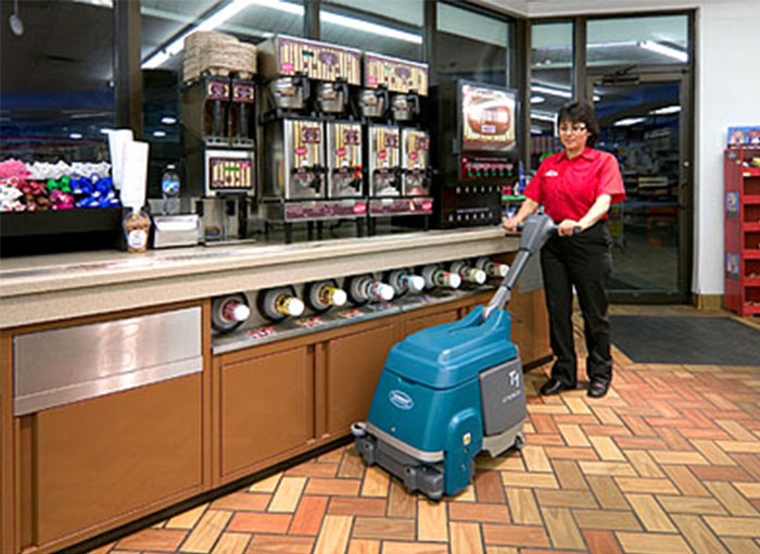 坦能T1B微型手推式洗地機可強力清潔狹小空間,完全替代拖把和水桶。可選配的鋰離子電瓶支持每天多次的洗地頻率。
